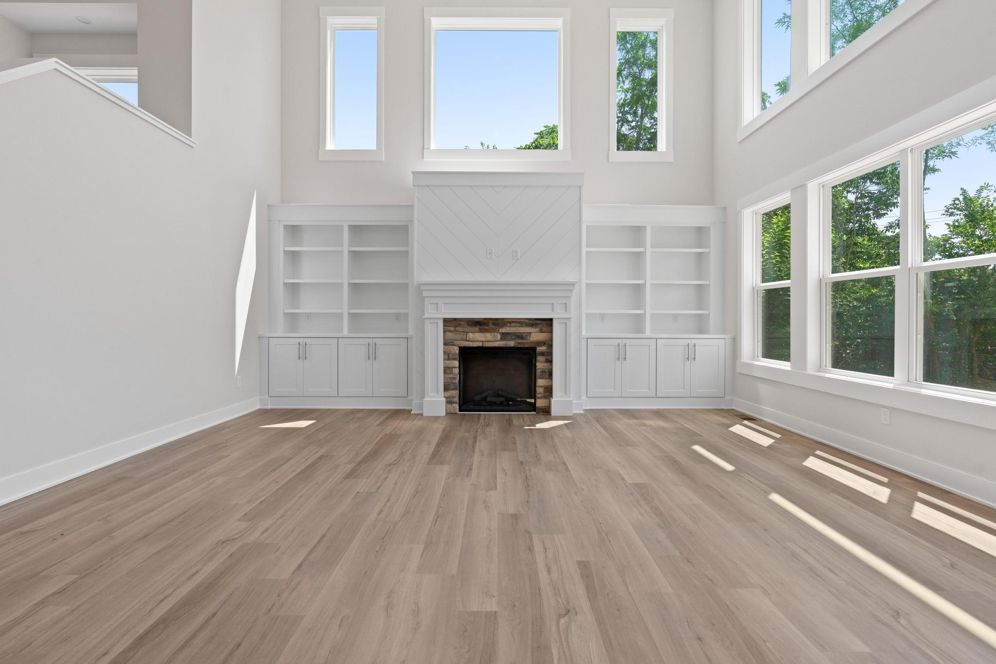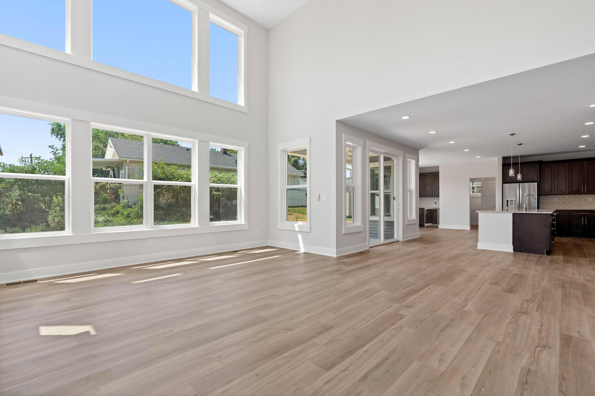 A charming, covered porch leads into the heart of the home with a convenient home office and an expansive great room, featuring soaring ceilings and ample natural light. Adjacent, the gourmet kitchen boasts modern finishes and a spacious dining area overlooking the backyard.